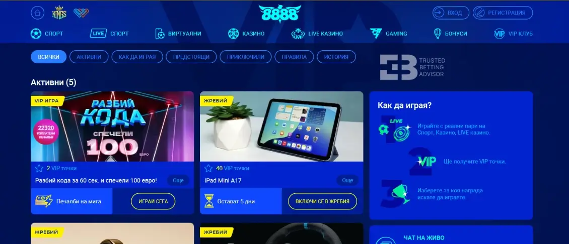 В допълнение към множеството жребий и игри с награди, често пъти виждаме и голям интерес към 8888 Разбий кода. Играта е фокусирана върху бързата печалба, като всеки, който разбие 4-цифрения код в рамките на 60 секунди може да се възползва от €100 награда. Този промокод за 8888 изисква едва 2 VIP точки за участие, като всеки играч има право да се възползва от колкото иска разбивания поред.