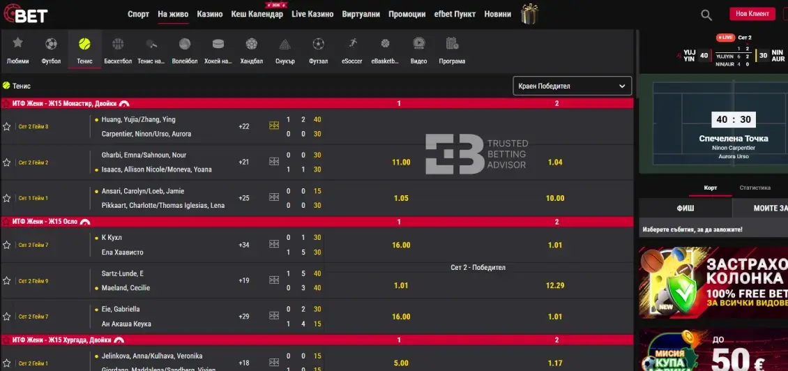 Централната конзола на сайта ви помага да се ориентирате спрямо най-търсените събития – в горната част намираме подредени най-горещите предстоящи двубои от тениса и футбола, а по-надолу намираме и в момента провеждащите се събития. От тях може да изберете и само тези, при които е налично видео предаване (Live Streaming).