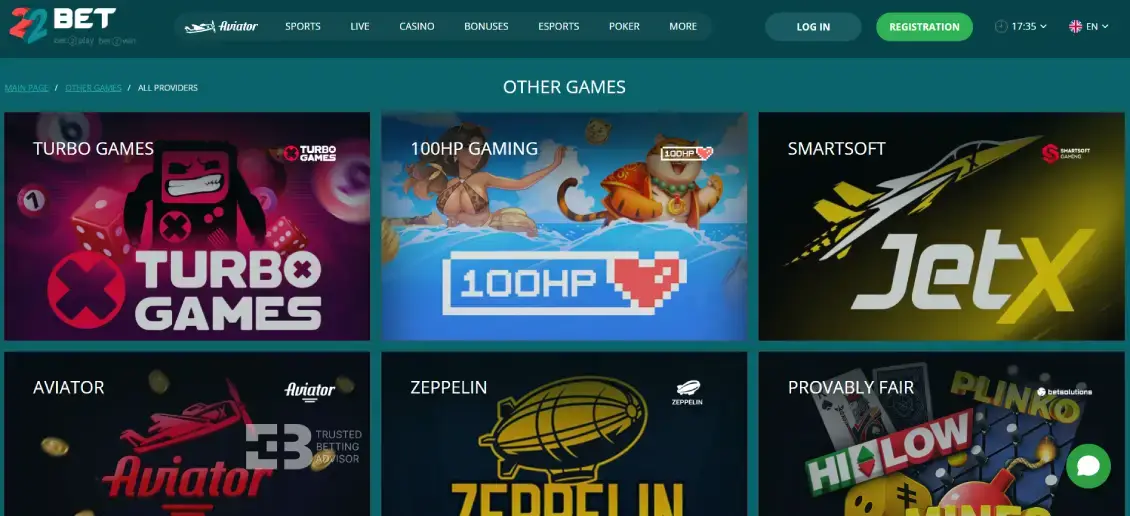 - 22Games – The bookmaker offers a unique collection of in-house, proprietary titles. These are arcade-style ‘quick games’ exclusive to the 22Bet brand. This ranges from dice, slot, and card classics to digital scratch cards.