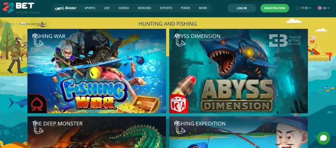 Hunting and fishing are niche categories of arcade-style games primarily used for shooting or fishing titles where users aim at moving targets to accumulate points or wins. These games are visually engaging and appeal to players who want more active participation than spinning reels. Popular options available at 22bet casino Kenya include Fishing War, Abyss Dimension, The Deep Monster, and Royal Shooter 2.