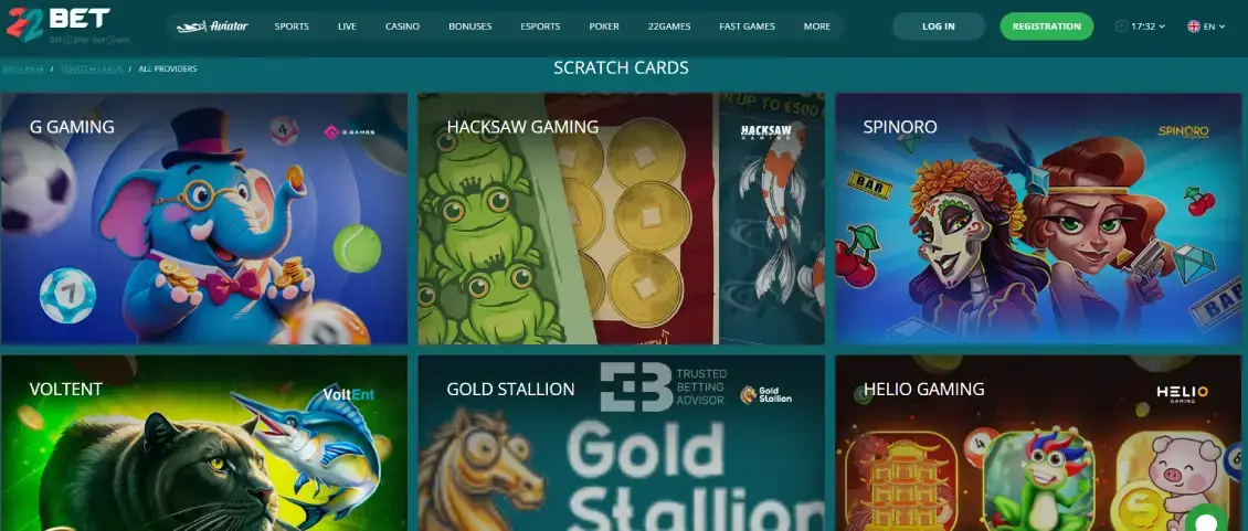 Online scratch cards are digital versions of the traditional cards. It features simple gameplay where you pick a card, reveal the symbols, and find out instantly whether you’ve won. Players at 22bet Kenya casino can pick different themed scratch cards from film, adventure, game shows, or classic slot games. Popular titles include Football Scratch, Cash Pool, Go Panda, and Crazy Donuts.