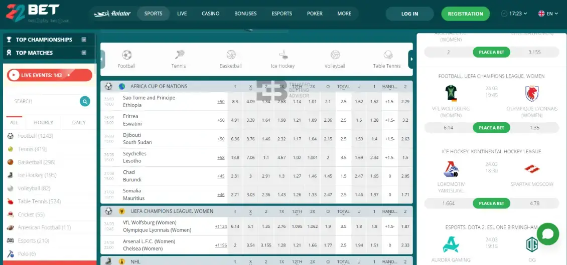 - Live Streaming – 22Bet offers live streaming on selected events, including tennis, table tennis, and other fixtures. Matches come with a text-based tracker and live panels. The live stream launches directly within the browser without requiring a separate app.