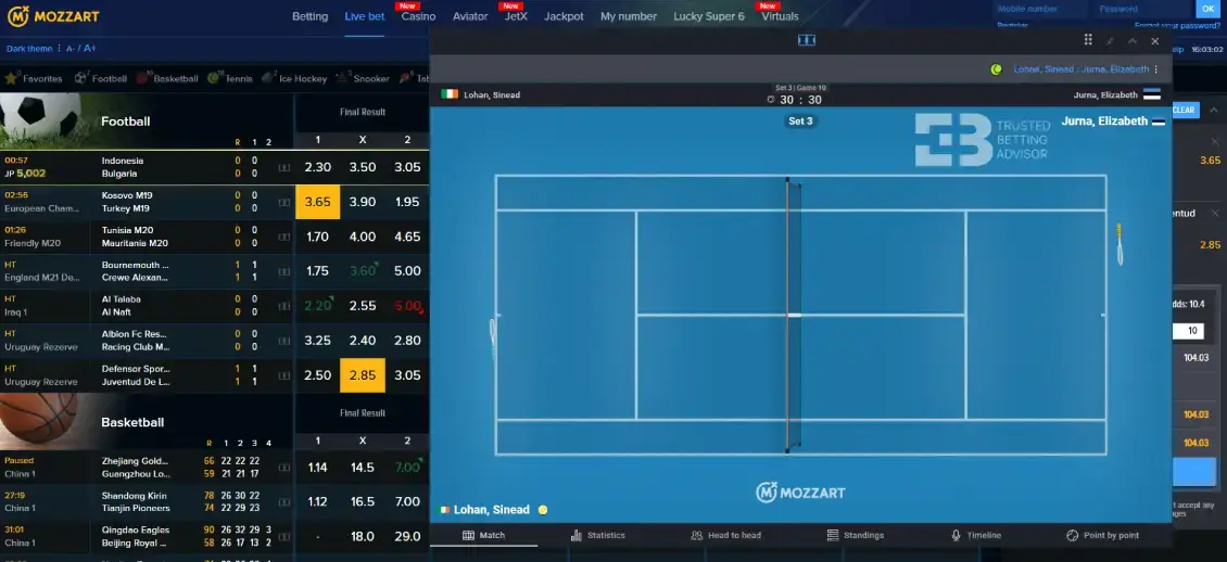 Mozzartbet operates an in-house live streaming service that covers selected football and tennis events. Streams are accessed from within the Live Bet section. Unfortunately, you won’t find European football and select tennis tournaments. However, there’s a play-by-play tracker with a live stats panel for enough context to bet in-play with confidence.