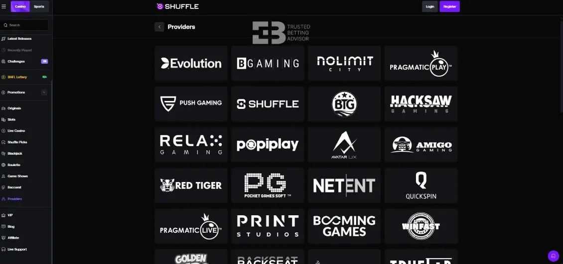 Shuffle online casino is able to offer hundreds of online casino games thanks to the strategic partnerships they has with leading software providers. Through these providers, they offer slots, live games, table games, and card games. You are able to enjoy different themes, RTPs, and mechanics in the games. With provably fair technology, the casino has amazing crypto-optimised titles. These providers are: