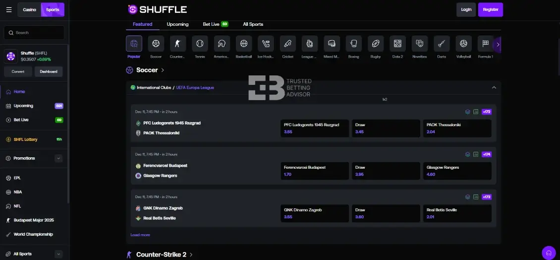 The live betting sessions at Shuffle were dynamic thanks to the multi-view streaming on some sports, real-time stats, and up-to-date odds that help in quick decision-making.