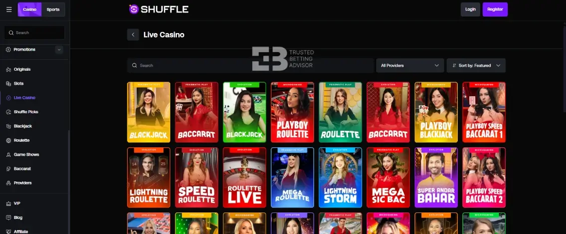 Shuffle casino live games offer world-class table games with real dealers, HD streaming, and cryptocurrency betting. The games are offered by providers like Pragmatic Play, Evolution Gaming, and Microgaming. From the lobby, players enjoy blackjack, roulette, game shows, and baccarat.