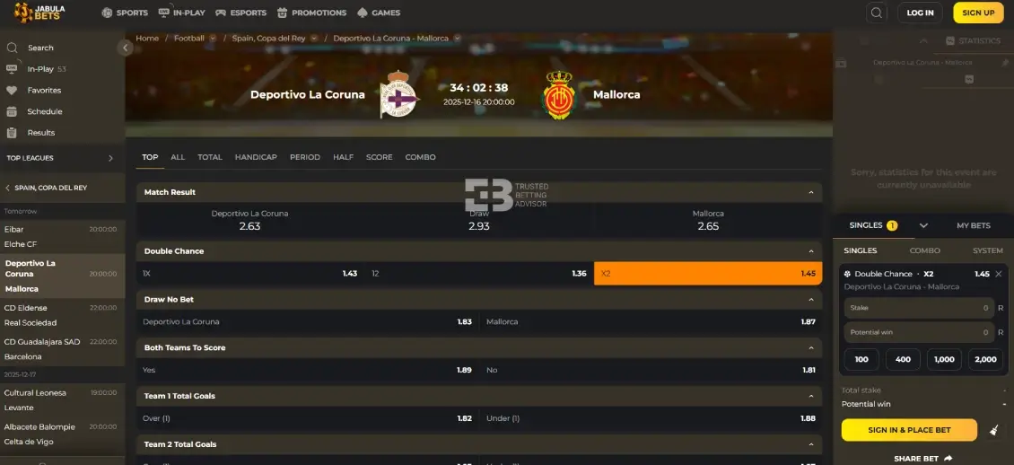 Once you see any game you like, click on it, and you’ll see available markets to add to your bet slip. After that, enter the stake amount and place your bet.